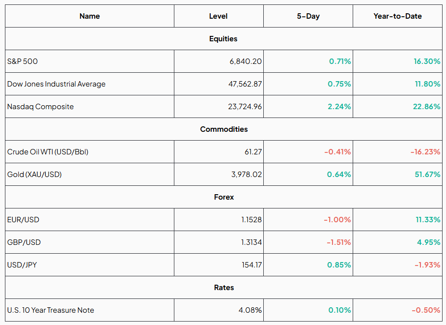 Equity markets advanced modestly over the week, supported by improved risk sentiment following steady macroeconomic signals.