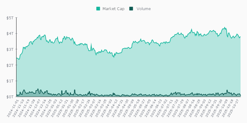 From October 27 to November 2, 2025, the total crypto market cap slipped 1.52%, swinging between a weekly high of about $4 trillion (Oct 27) and a low near $3.72 trillion (Oct 31) before ending around $3.8 trillion. Trading activity rose 5.33% over the same period to roughly $81.6 billion, signaling a modest pickup in participation even as prices softened.