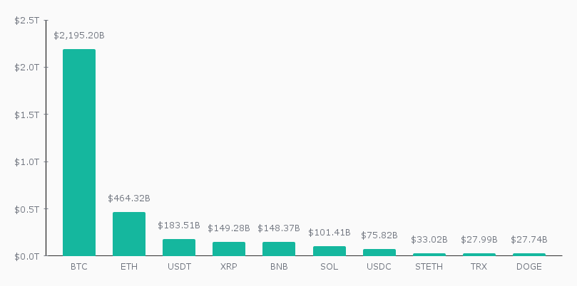 Bitcoin (BTC) continues to dominate the cryptocurrency market with a capitalization of $2.20 trillion (58.1%), maintaining a strong lead over Ethereum (ETH), which holds $464.3 billion (12.3%). Stablecoins Tether (USDT) and USD Coin (USDC) remain key pillars of liquidity, representing 4.9% and 2.0% of the market, respectively. XRP and BNB are nearly tied in market value at around $149 billion each, jointly accounting for 7.8% of total capitalization. Solana (SOL) follows with $101.4 billion (2.7%), while Lido Staked Ether (stETH), TRON (TRX), and Dogecoin (DOGE) round out the top ten with market shares below 1% each. Overall, the market remains heavily concentrated in Bitcoin and Ethereum, which together comprise more than 70% of the total crypto capitalization.