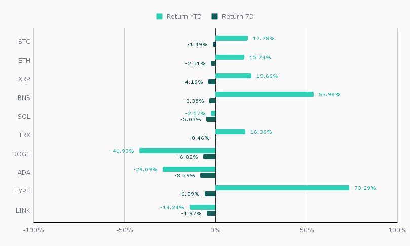 The crypto market saw a broad pullback during this week, with most major assets posting negative returns. Bitcoin (BTC) slipped 1.49% to around $109,889, while Ethereum (ETH) dropped 2.51% to approximately $3,852. Among large-cap altcoins, Solana (SOL) led the declines with a 5.03% weekly loss, and Cardano (ADA) fell even further, down 8.59% to $0.60. Dogecoin (DOGE) also tumbled 6.82%, extending its steep year-to-date decline of more than 41%.