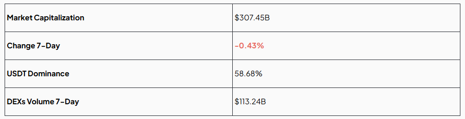 Looking at individual assets, Tether (USDT) accounts for 59.68% of the total stablecoin market, valued at $183.48 billion, reflecting a 0.22% increase over the week. USD Coin (USDC) follows with a market capitalization of $75.39 billion, representing 24.52% of the stablecoin market and marking a 0.63% decline over the same period.