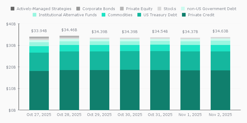 As of November 2, 2025, the total value of tokenized real-world assets (RWAs) on-chain stood at approximately $34.63 billion, marking a 2.79% increase from the previous week's levels. Private credit remained the dominant category with $18.44 billion, accounting for over half of the total market, followed by U.S. Treasury debt, which climbed to $8.73 billion amid sustained demand for yield-bearing, regulated instruments. Commodities-largely gold-backed tokens-rose slightly to $2.97 billion, while institutional alternative funds saw a notable uptick of 10.41%, reaching $1.95 billion, driven by renewed institutional participation. Other categories such as non-U.S. government debt, stocks, and corporate bonds remained relatively stable. Overall, the week reflected a steady expansion of the tokenized asset market, with capital continuing to concentrate in private credit and Treasury-backed products as investors favored on-chain exposure to traditional yield-generating instruments.
