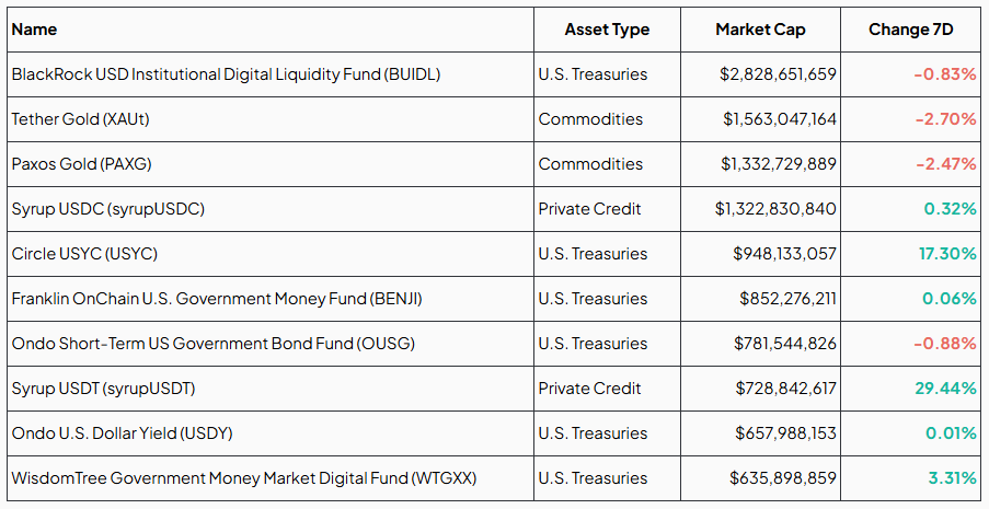 The tokenized asset market this week was marked by mixed performance across categories, led by continued institutional traction in U.S. Treasuries-backed products. BUIDL remained the largest tokenized fund with a market cap of $2.83 billion, though it dipped 0.83% over the week. In contrast, Circle's USYC saw strong growth, surging 17.3% to $948 million, highlighting rising demand for on-chain Treasury exposure. Among newer entrants, Syrup USDT recorded an impressive 29.44% weekly jump to $729 million, reflecting growing investor interest in private credit-backed assets. Meanwhile, commodity-backed tokens such as Tether Gold (XAUt) and Paxos Gold (PAXG) declined 2.7% and 2.47%, respectively, as gold-linked assets softened alongside broader market caution. Overall, the segment continues to show a clear preference for regulated U.S. Treasury products.