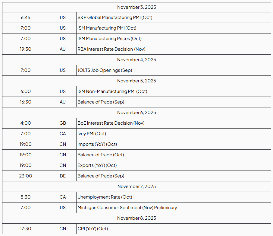 Next week, market attention will center on U.S. business activity and labor market data - including the ISM PMIs and the JOLTS Job Openings report - while rate decisions from the Reserve Bank of Australia and Bank of England will be closely watched for guidance on future policy direction