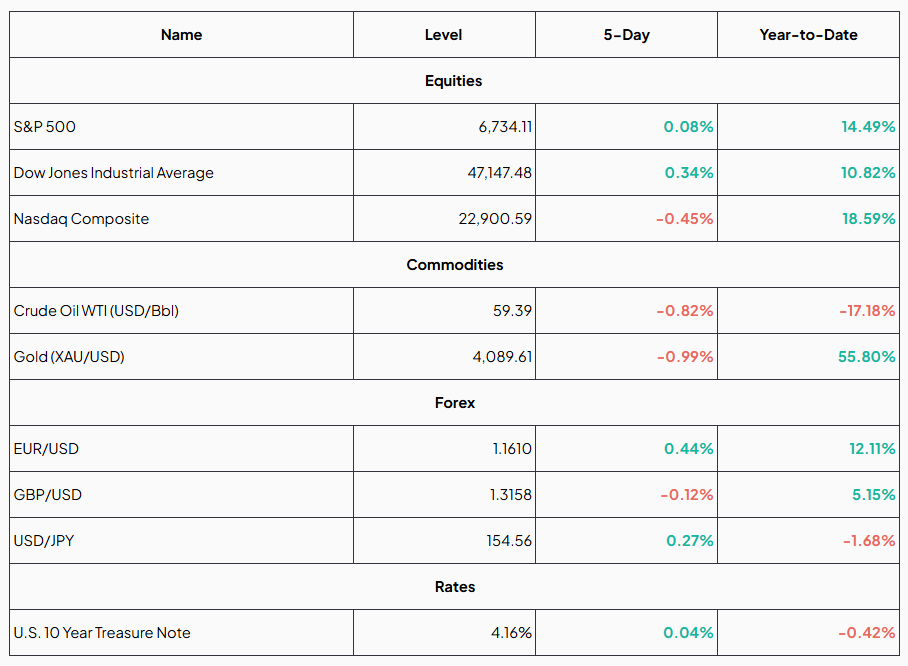 Global markets delivered a mixed performance this week as investors navigated uneven sector trends, shifting risk sentiment, and diverging moves across major asset classes. U.S. equities remained close to record highs, but trading was choppy as market leadership stayed concentrated in a narrow group of large-cap names.