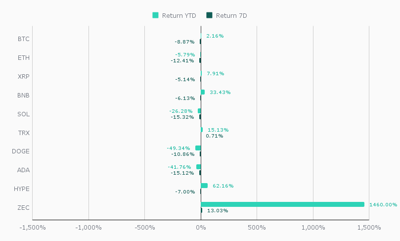 Sentiment-driven assets also struggled. Dogecoin dropped 10.86%, leaving it nearly -50% year-to-date, while Cardano fell 15.12%, extending its YTD downturn to -41.76%. These moves reflect a broader rotation away from speculative tokens during the week.