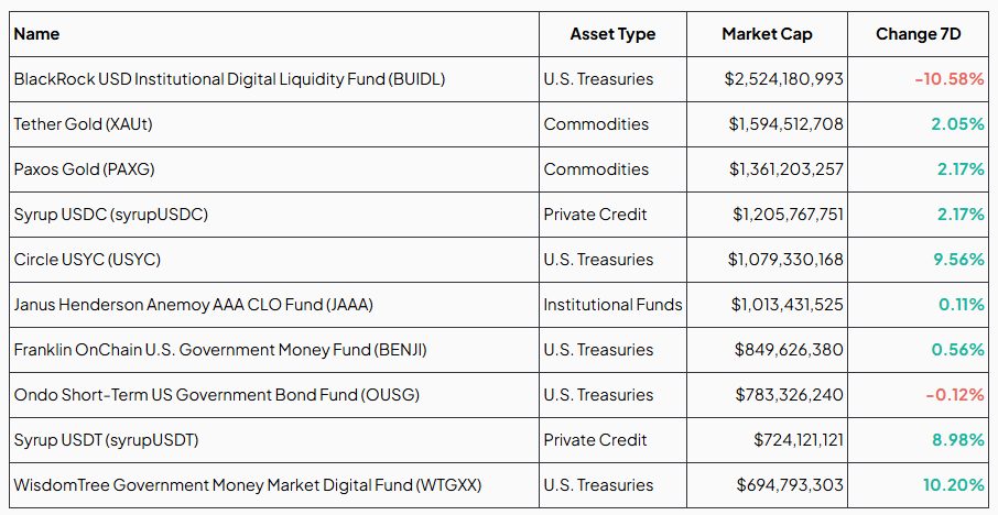 Private credit-linked tokens also showed positive momentum. Syrup USDC (syrupUSDC) grew by 2.2% to reach $1.2 billion, while Syrup USDT (syrupUSDT) rose sharply by 9%, now totaling $724 million. These increases underscore the expansion of tokenized private credit strategies, highlighting growing demand for yield-oriented assets within on-chain markets.