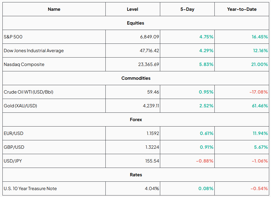 Global markets posted a broadly positive performance this week, with risk sentiment improving as investors responded to rising market expectations of future Federal Reserve rate cuts, even as policymakers maintained a cautious tone. U.S. equities rallied sharply, supported by renewed enthusiasm for growth sectors and a rebound in cyclical names, while commodity and currency markets reflected a shifting macroeconomic backdrop driven by a softer U.S. dollar and evolving global demand dynamics.