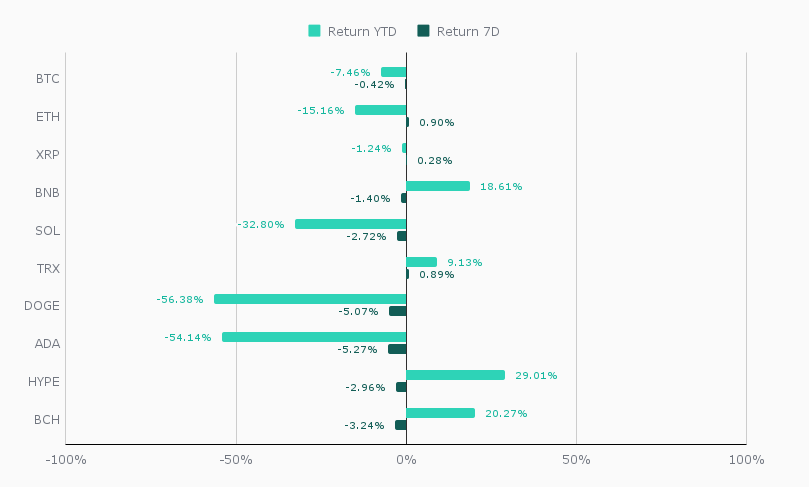 There were, however, a few relative bright spots. TRON gained 0.9% for the week and remains up 9.1% year-to-date, supported by its steadier profile. Hyperliquid slipped 3% but still holds a strong 29% YTD gain, while Bitcoin Cash fell 3.2% yet maintains a solid 20.3% rise for the year, evidence that selective pockets of resilience persist even as broader conditions remain cautious.