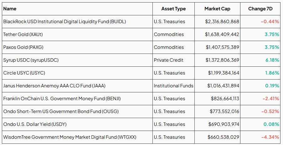 The top tokenized real-world asset products showed a varied set of movements this week, reflecting both asset-class dynamics and shifting investor preferences. The largest product, the BlackRock USD Institutional Digital Liquidity Fund (BUIDL), posted a 0.4% decline, bringing its market cap to $2.32 billion. While modest, the decrease suggests a slight pullback in on-chain institutional liquidity allocations, consistent with the broader pause in treasury-linked token flows observed over the past several sessions.