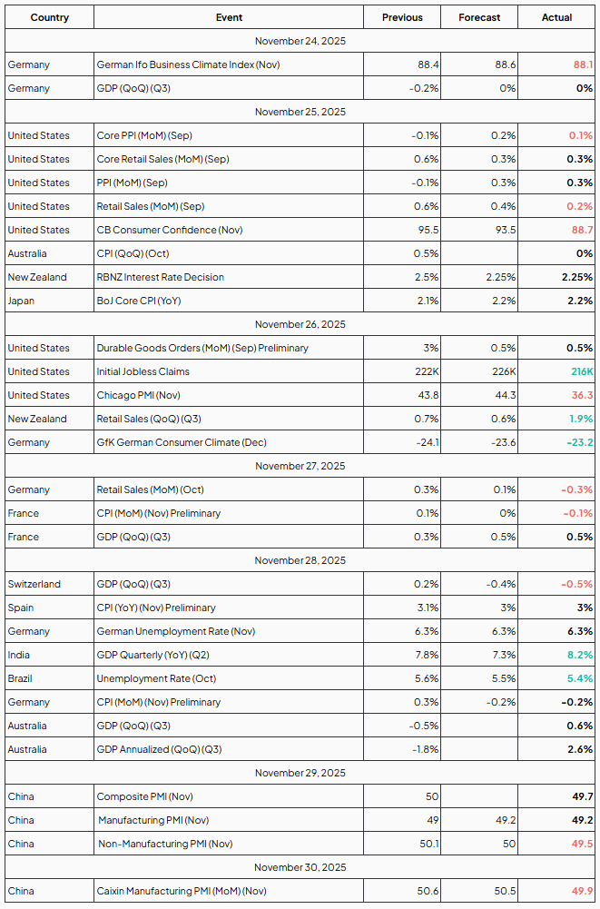 France delivered a mixed but largely positive economic picture, with GDP expanding 0.5% in the third quarter, its fastest pace in several quarters, driven mainly by a rebound in exports, especially in transport equipment. At the same time, inflation softened in November, as the preliminary CPI fell 0.1% month-on-month, highlighting subdued price pressures and cautious household spending. The combination of stronger growth and easing inflation suggests that while external demand is supporting activity, domestic momentum remains fragile heading into year-end.