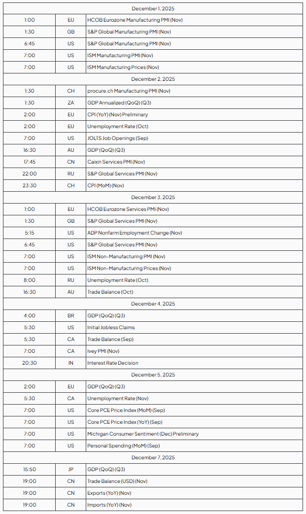 Next week's data releases offer a broad view of global economic conditions, with a strong focus on U.S. labor and services activity through ADP employment, jobless claims, and key PMI readings. Core PCE and Michigan Sentiment will also help refine expectations around inflation and consumer strength.