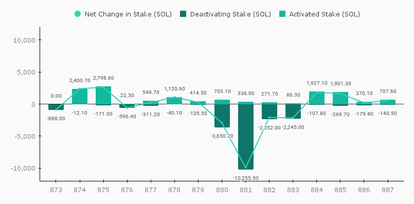 Stake movements across epochs 873-887 reflect another month of shifting dynamics within the Solana staking ecosystem, resulting in a total net outflow of approximately -7,745 SOL. Although the period included several moderate inflows that added healthy balance to our stake, these were ultimately outweighed by a series of larger deactivations mid-month. A single significant withdrawal contributed heavily to the overall decline, shaping the month's net negative position.