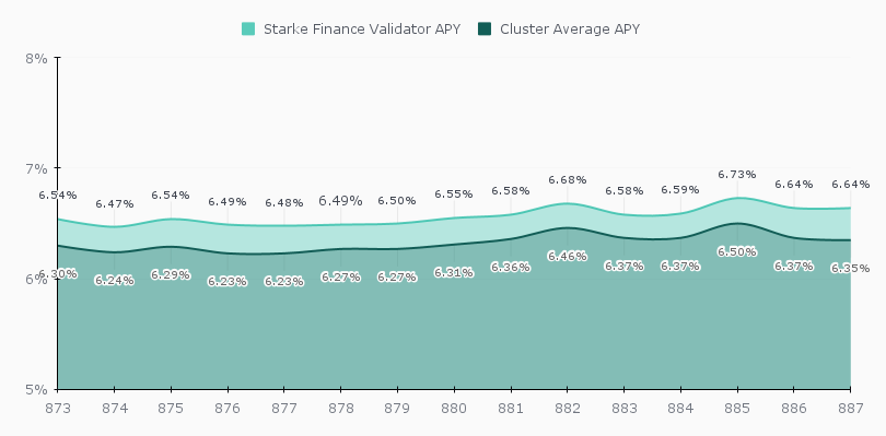 In November, Starke Finance once again delivered returns that outpaced the network average, reinforcing our consistent performance leadership across recent epochs. Throughout Epochs 873-887, our validator achieved an average APY of 6.57%, surpassing the cluster-wide benchmark of 6.33% by 24 basis points.
