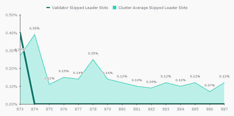 Starke Finance continued to demonstrate outstanding leader slot reliability throughout the past 15 epochs, maintaining a 0% skipped leader slot rate in 14 out of 15 periods. The only deviation occurred in epoch 873, where a minimal 0.4% skip rate was observed, a small and isolated fluctuation. All subsequent epochs returned to a flawless 0% skip rate, underscoring the stability and responsiveness of our validator infrastructure.