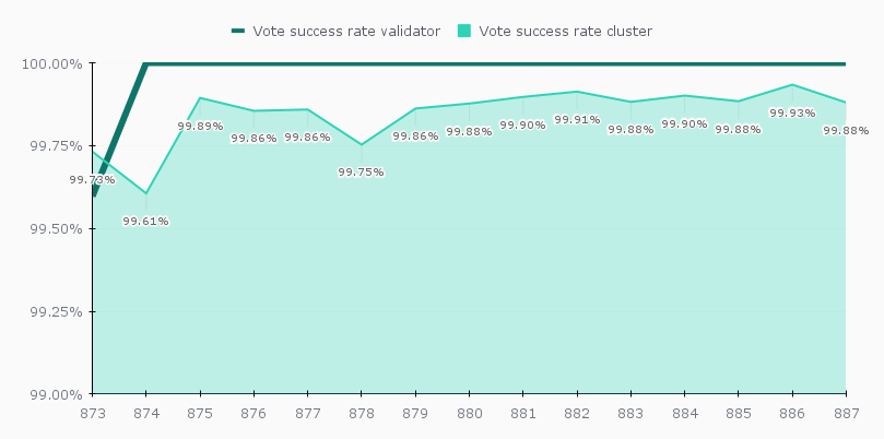 During this period, the cluster average ranged between 99.6% and 99.9%, placing Starke Finance firmly above or fully aligned with network-wide performance throughout nearly all epochs. This consistency reinforces our validator's reliability and precision in confirming votes and contributing to secure block finalization.