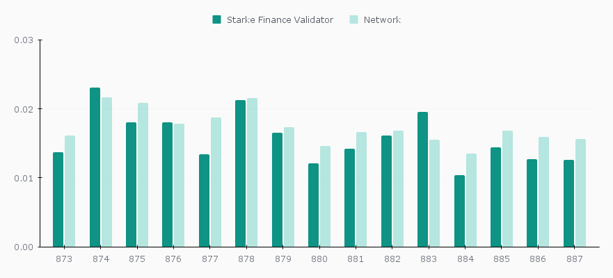 Across epochs 873-887, Starke Finance maintained stable and competitive block rewards, averaging results closely aligned with network conditions. During this period, our validator's block rewards ranged between 0.0104 and 0.0231 SOL, while the cluster average moved between 0.0135 and 0.0217 SOL. Despite the natural variability inherent to Solana's block production cycles, Starke Finance continued to deliver consistent and reliable reward generation.