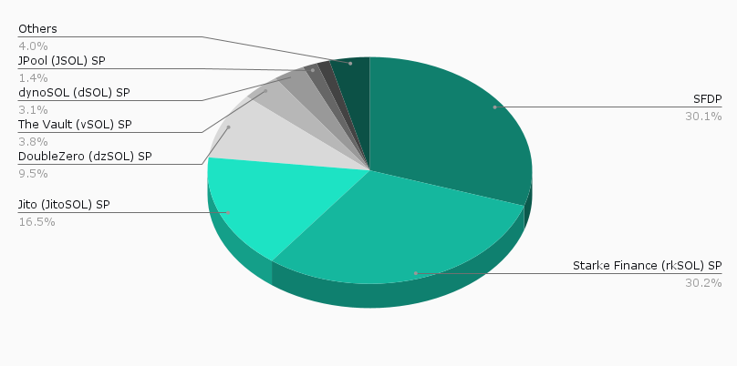 As of the end of November, Starke Finance's active stake stood at 242,116 SOL, reflecting a well-balanced distribution across institutional partners, staking pools, and independent delegators. The Solana Foundation Delegation Program (SFDP) remains a key contributor, representing 30.07% of the total active stake, closely followed by rkSOL, Starke Finance's own liquid staking pool, with 30.24%. Other significant contributors include Jito (16.52%), DoubleZero (9.46%), The Vault (3.80%), dynoSOL (3.15%), JPool (1.45%), and Edgevana (1.29%), supported by a broad mix of independent delegators and several stake pools contributing smaller amounts, together representing 4.03% of the total stake.