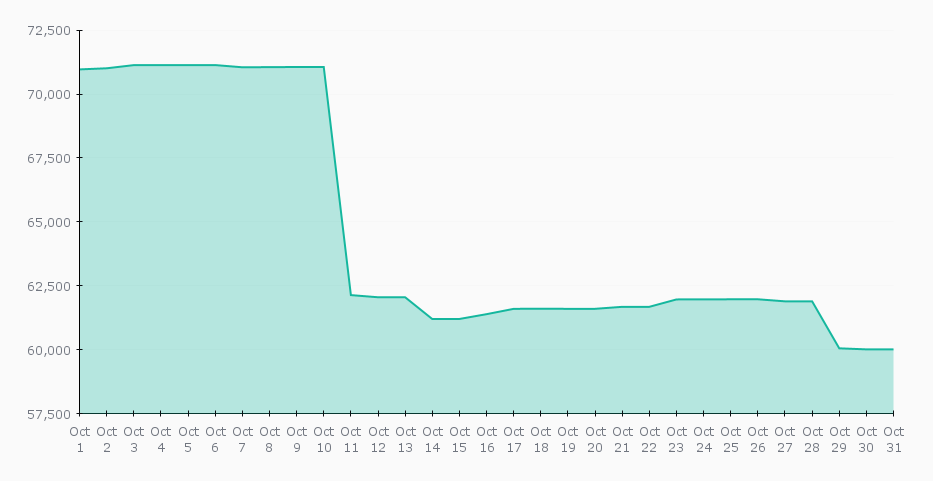 The circulating supply of rkSOL declined notably throughout October, falling from 70,961.78 tokens on October 1 to 60,018.15 tokens by October 31, a net decrease of approximately 15.5%.