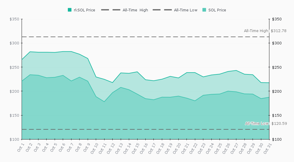 The price of rkSOL declined by 18.73% in October, falling from $265.46 on October 1 to $217.47 on October 31. After a steady start to the month, rkSOL underwent a brief correction in mid-October, mirroring broader market movements across the Solana ecosystem. Despite this volatility, the asset remained well above its all-time low of $120.59 and maintained a solid position following September's record high of $312.78.