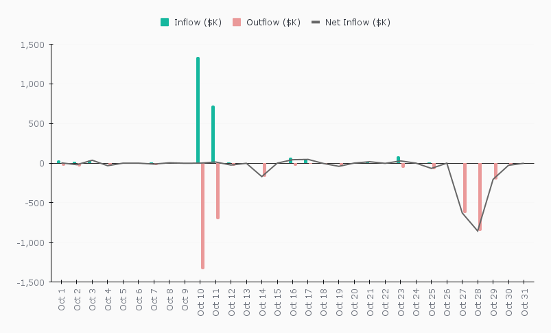 Mid-month activity was particularly pronounced: October 10 and 11 recorded large gross inflows and outflows exceeding $1.3 million and $700K, respectively, which largely offset each other and resulted in a neutral net impact. However, in the final week of the month, several sharp outflow spikes - most notably $628.25K on October 27, $856.12K on October 28, and $204.37K on October 29 - drove the aggregate result deeper into negative territory.