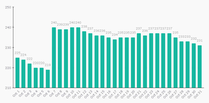 Holder counts fluctuated throughout the month, with brief dips during the second week, reaching a low of 219 on October 6, followed by a sharp recovery around October 7-11, when the number of addresses briefly peaked at 240. This volatility reflected short-term repositioning around periods of elevated trading activity rather than any structural changes in participation.